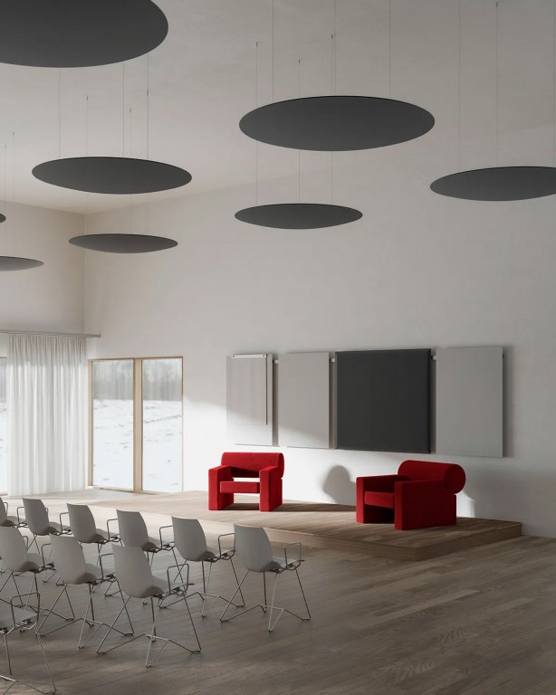 Geluidsabsorberende tafel in ronde en ovale versie met bladen in vele maten.