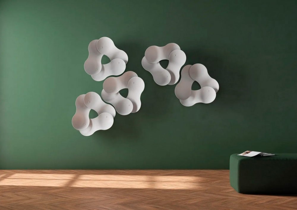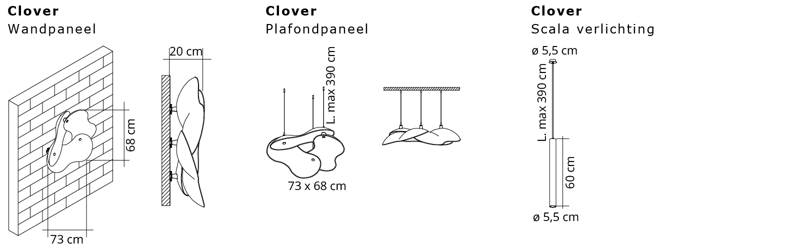 Clover is een driedimensionaal geluidsabsorberend polyester element dat bestaat uit drie holle en overlappende panelen die met elkaar verbonden zijn door middel van gegoten metalen verbindingen. Het element kan met magneten aan de muur worden bevestigd of aan het plafond worden opgehangen met drie in lengte verstelbare stalen kabels. De afzonderlijke elementen kunnen eindeloos worden gecombineerd, waardoor u op elk gewenst moment nieuwe configuraties kunt creëren.