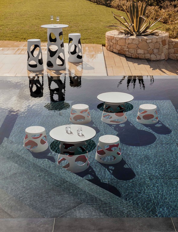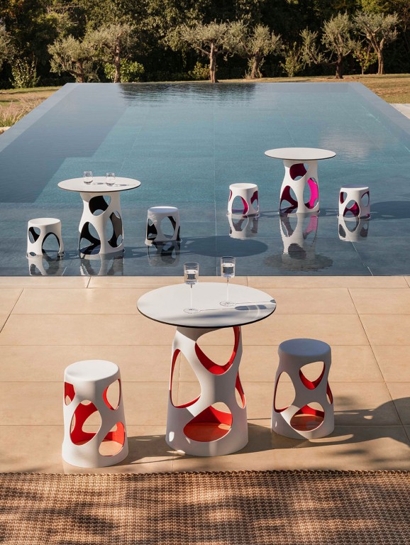 Liberty is een collectie krukken, tafels en lampen met een zeer verrassend 2-kleuren effect. Het kunststof heeft aan de buitenzijde een totaal andere kleur dan aan de binnenzijde. Het verrassende effect wordt voor een belangrijk deel veroorzaakt door de grote afgeronde uitsparingen. Hierdoor kijk je als het ware naar binnen en zie je de contrasterende kleur van de binnenzijde.