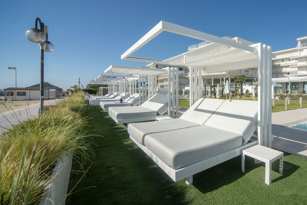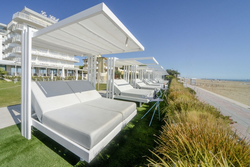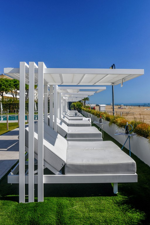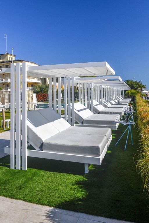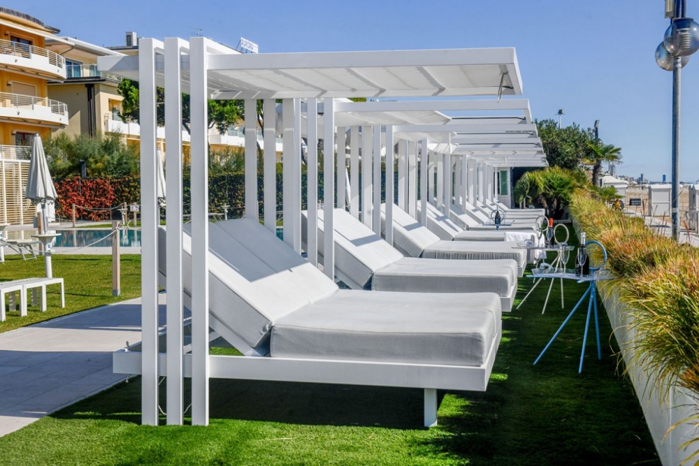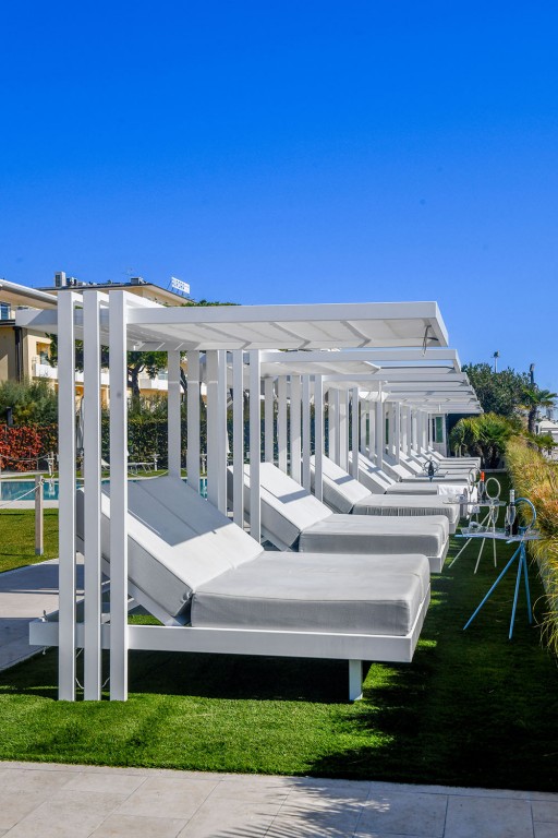 Soletto, het tuinbed, is een authentiek toevluchtsoord voor wie in alle comfort wil ontspannen en een uniek moment in de buitenlucht wil ervaren. Het heeft een lineair, bijna minimalistisch ontwerp, met geometrische vormen die een moderne en tijdloze sfeer creëren. De steunpoten, die het bed een zwevend uiterlijk geven, en de steunkolommen die het omlijsten alsof Soletto een schilderij is, geven extra waarde aan het algehele uiterlijk. Het onderscheidende kenmerk ligt in de open structuur die een gevoel van vrijheid biedt en een panoramisch uitzicht biedt op de omgeving. Het aluminium frame en de waterafstotende stoffen van de dubbele matras met verstelbare rugleuning maken het perfect voor elke buitenomgeving, of het nu bij het zwembad, in de tuin of op het strand is. Daarom is het ideaal voor contractomgevingen of huiselijke buitenruimtes.