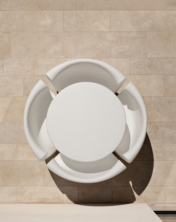 De basis combinatie van de Community set bestaat uit 4 stoelen Rhonda en 1 tafel Teddy, leverbaar in mat polyethyleen.