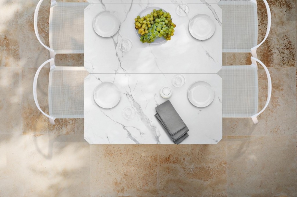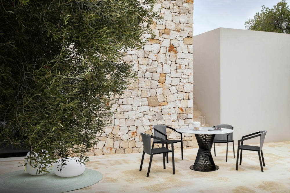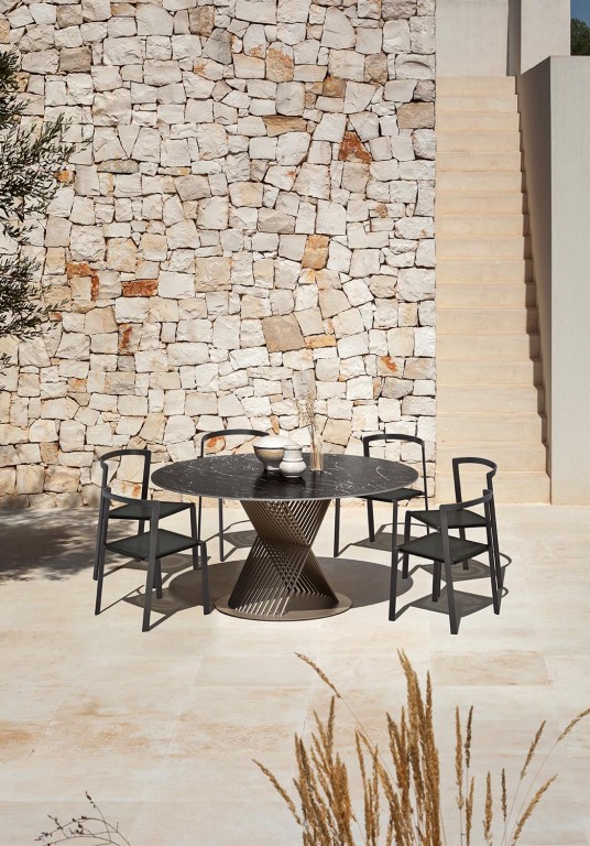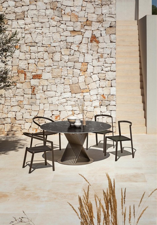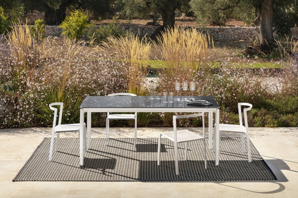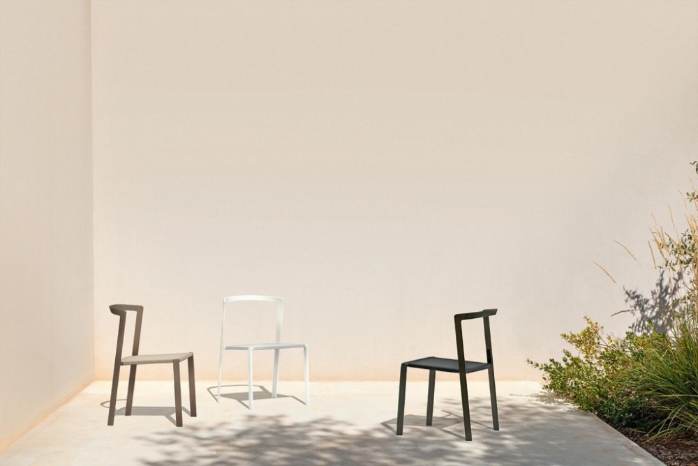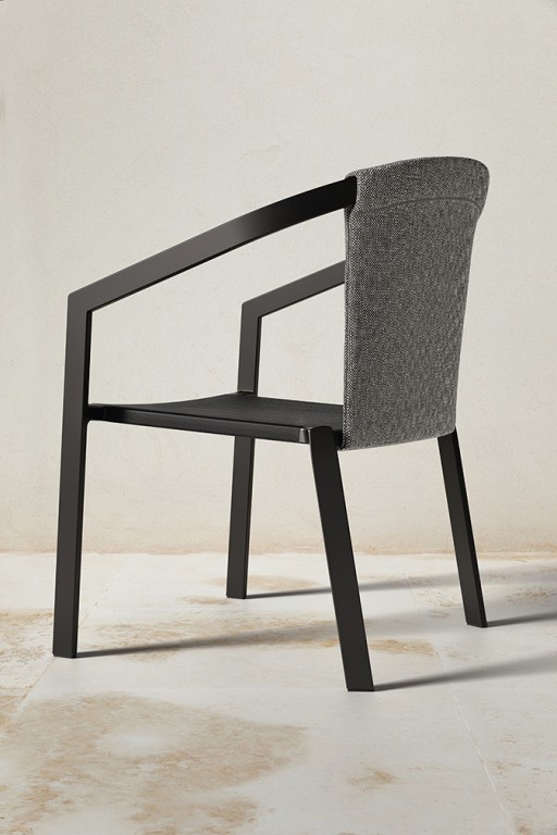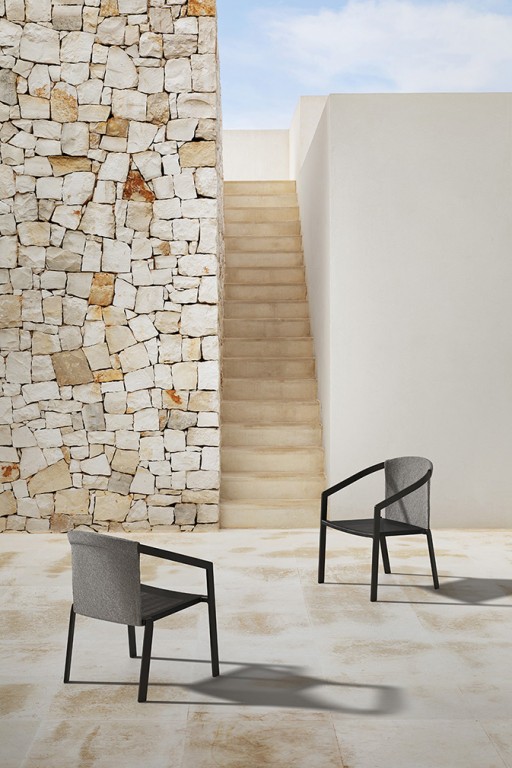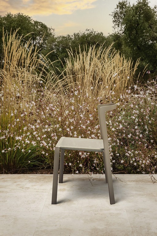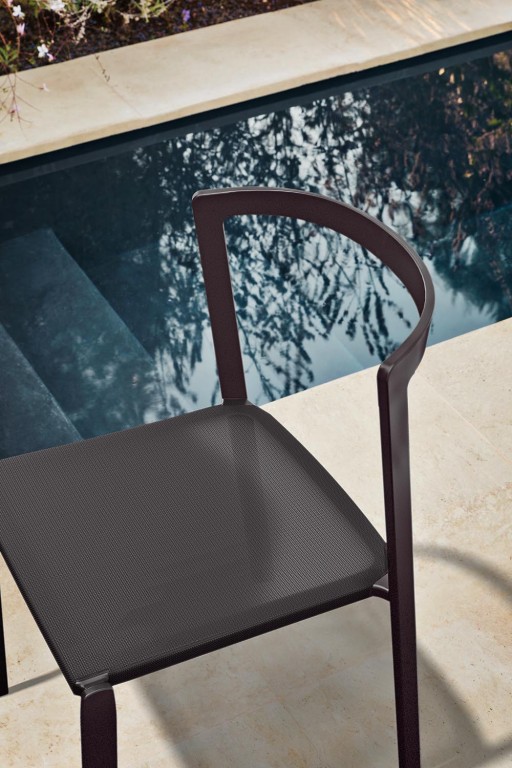 Het aluminium frame is in kleur gecoat en de zitting is vervaardigd van een textileen webbing. De dichte rugleuning is bekleed met een meubelstof. In deze stof is optioneel nog een los zitkussen verkrijgbaar. De stoelen zijn verkrijgbaar in drie kleurcombinaties die u kunt zien bij Uitvoering.