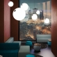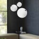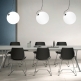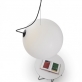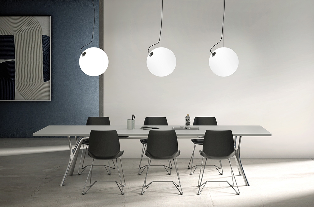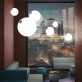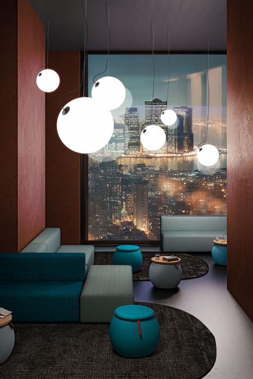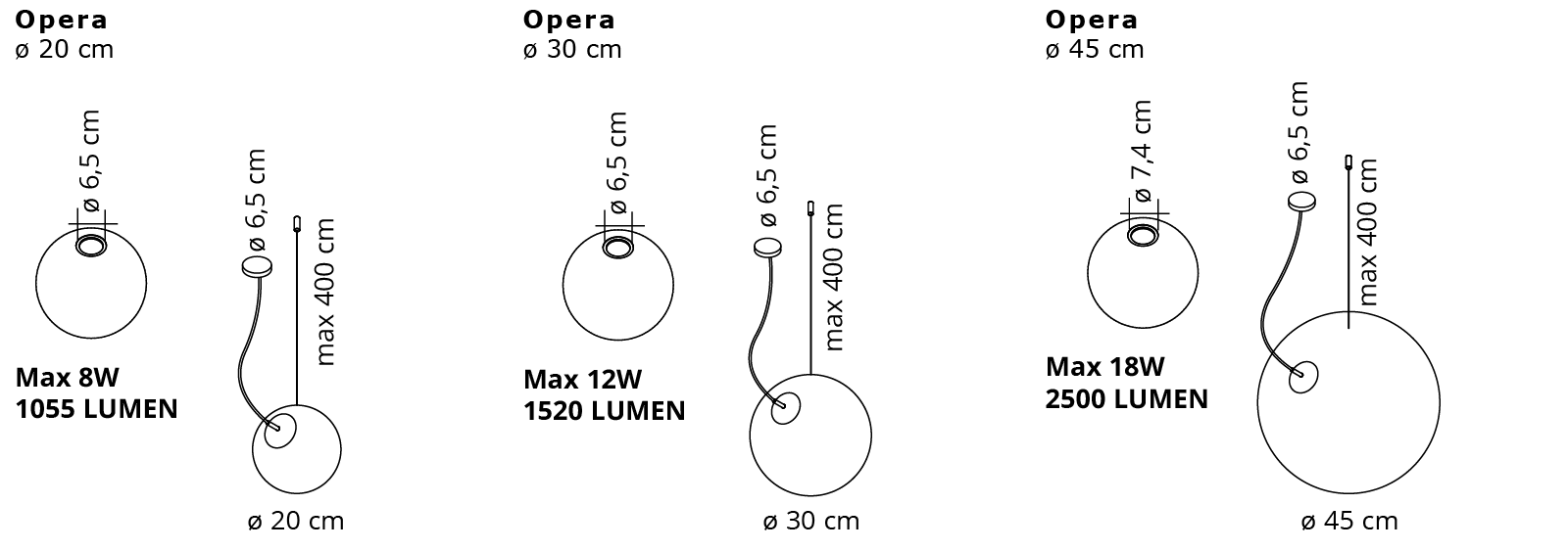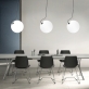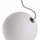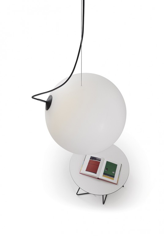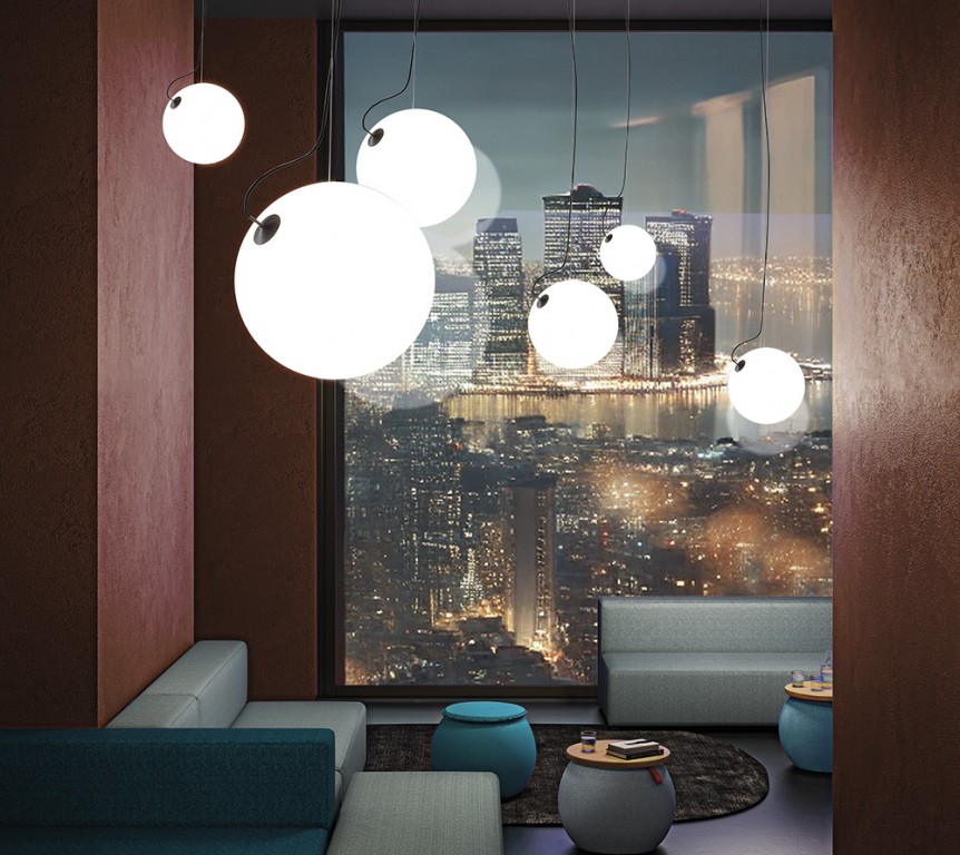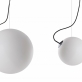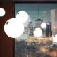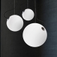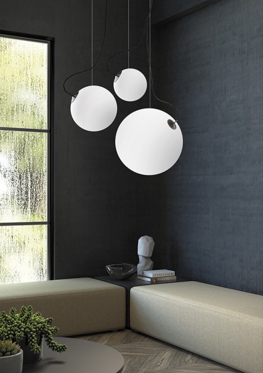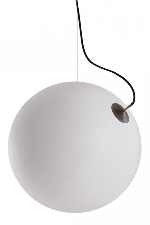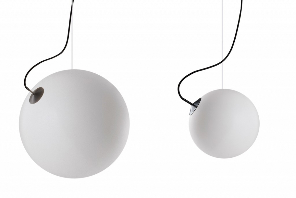 Bolvormige lampen van doorschijnend technopolymeer. Uitgerust met in hoogte verstelbare kabels voor ophanging aan het plafond, zijn ze verkrijgbaar in drie verschillende maten. Het unieke van dit object ligt in de opzettelijk verkeerde uitlijning van de stroomkabel ten opzichte van de ophanging, wat de lamp een vrij aangename asymmetrie geeft.