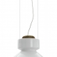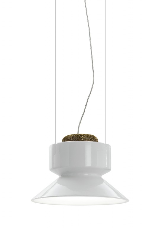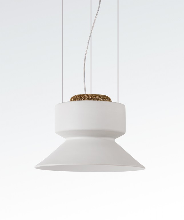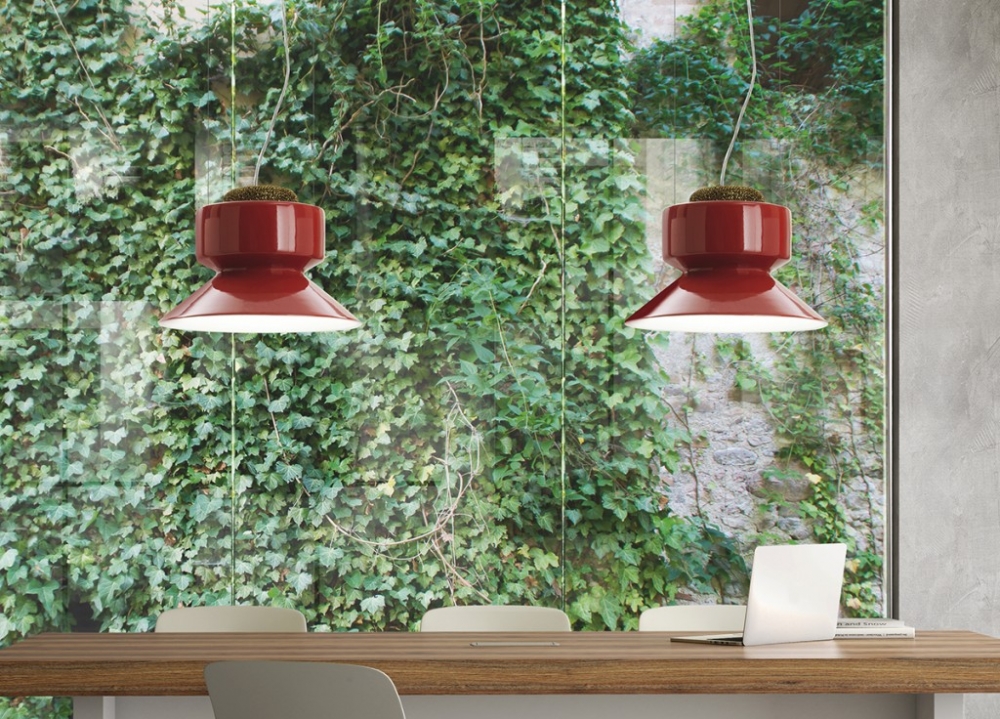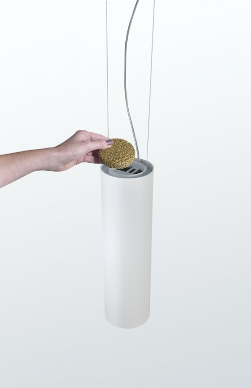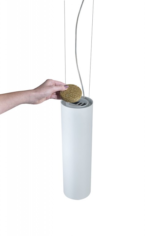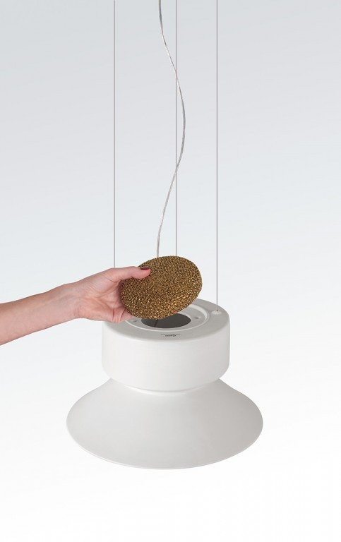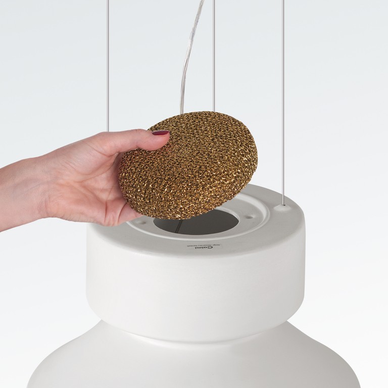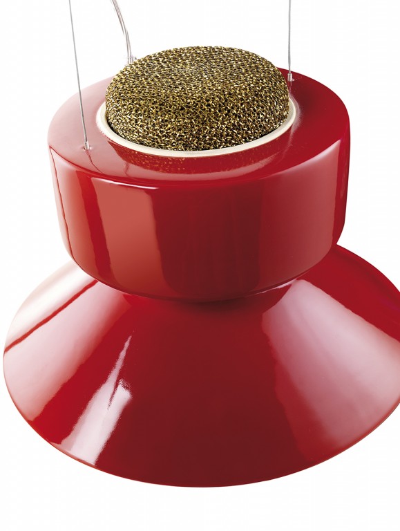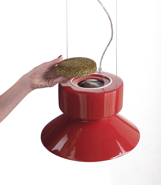 Hanglamp in aardewerk of aluminium, uitgerust in het bovenste gedeelte van de lampenkap met een filter voor luchtzuivering. Air purification technology: het Teleta-project is geboren met het precieze doel om de energie die verloren gaat als warmte van LED-bronnen te hergebruiken, en zo hun energetische duurzaamheid te verbeteren. De lamp verwarmt de lucht in het bovenste gedeelte, waardoor een convectieve beweging ontstaat. De verwarmde lucht gaat door een filter van gegalvaniseerd aluminium gaas, behandeld met zilverionen, en zuivert zichzelf.