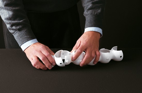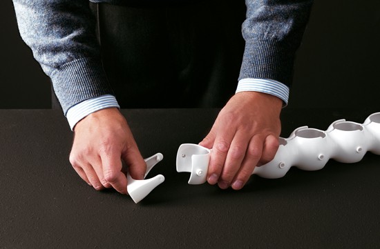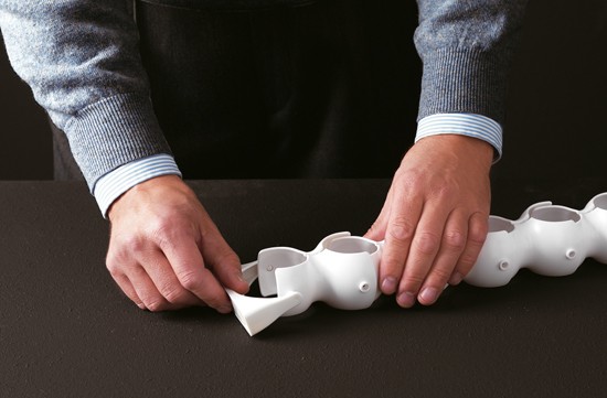 Biss is een originele en gepatenteerde flexibele kabelgoot. Het tecnopolymeer kunststof is leverbaar in twee kleuren: grijs en wit. Biss bestaat uit een drietal componenten: een kabelgoot met een lengte van 79cm. met aan een zijde een montagesteun en aan de andere zijde een gewicht.