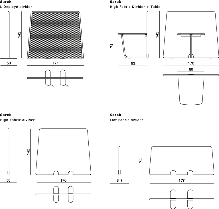 De schermen zijn hebben een breedte van 170 cm. en zijn leverbaar met een hoogte van 74 cm. en 142 cm.