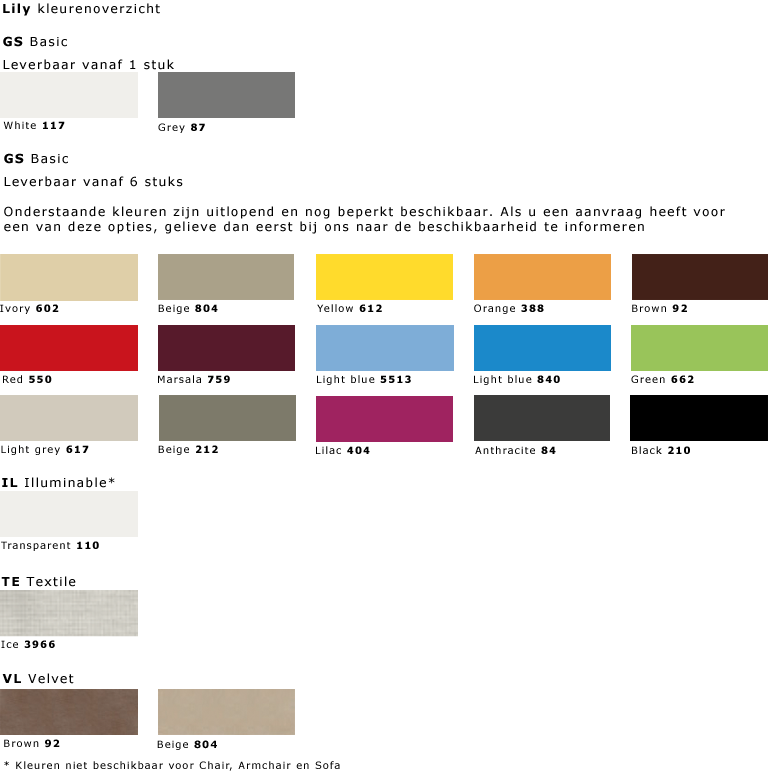Lily is een produktfamilie bestaande uit een stoel, een fauteuil, een tafel en een bankje. Voor de zitelementen zijn bijpassende zitkussens leverbaar met een afneembare stof. Lily is vervaardigd uit polyethyleen en kan worden geleverd in diverse kleuren in mat of gespoten in een hoogglans lak.