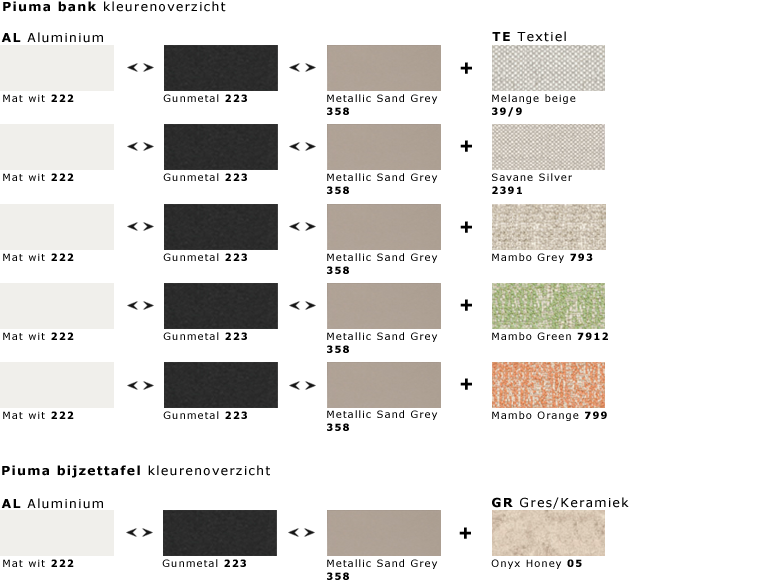 De kussens zijn gevuld met polyurethaan van verschillende dichtheden met daaromheen een ademende waterproof membraan en een hoes met een waterafstotende stof geschikt voor buiten gebruik. Deze bekleding is beschikbaar in drie tinten met opvallende gestikte naden. Piuma is uitgerust met een ligsysteem waarmee u zowel de armleuningen als de rugleuningen kunt laten zakken. Het modulaire karakter van de Piuma stelt u in staat om verschillende en meerdere composities te creëren, waardoor ze in elke context kunnen worden ingevoegd.