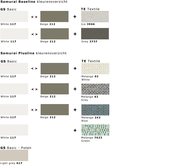 Samurai is verkrijgbaar in een aantal vastgestelde kleurcombinaties. een overzicht hiervan treft u aan bij 'uitvoeringen'.