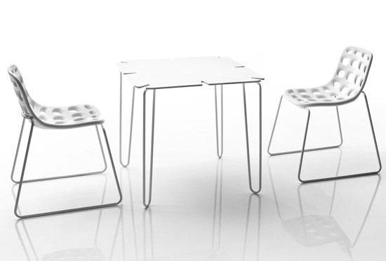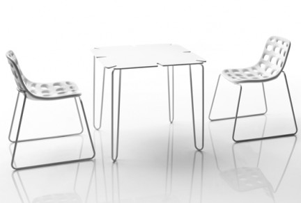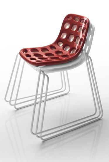 Chips is de naam van de nieuwe produktfamilie van MyYour. Zowel buiten als binnen toepasbaar en leverbaar als stoel, kruk, tafel en koppelbaar bankje. De stoel is leverbaar met een slede frame of op vier poten en is stapelbaar. De zitschaal van polyethyleen is leverbaar in wit, zwart, rood en lichtgrijs.