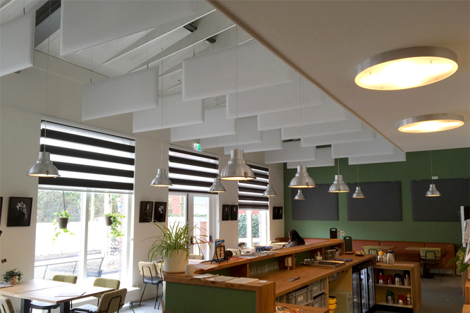 Restaurant AIM te LoosdrechtBij het prachtig aan het water gelegen restaurant AIM te Loosdrecht was de wens het geluid in het restaurant bij volledige bezetting wat te dempen. Dat wilde de restaurateur combineren met een esthetische toevoeging op de achterwand. De Flap panelen lenen zich hier bijzonder goed voor en hebben tot zo tot een tweeledig resultaat geleid. |